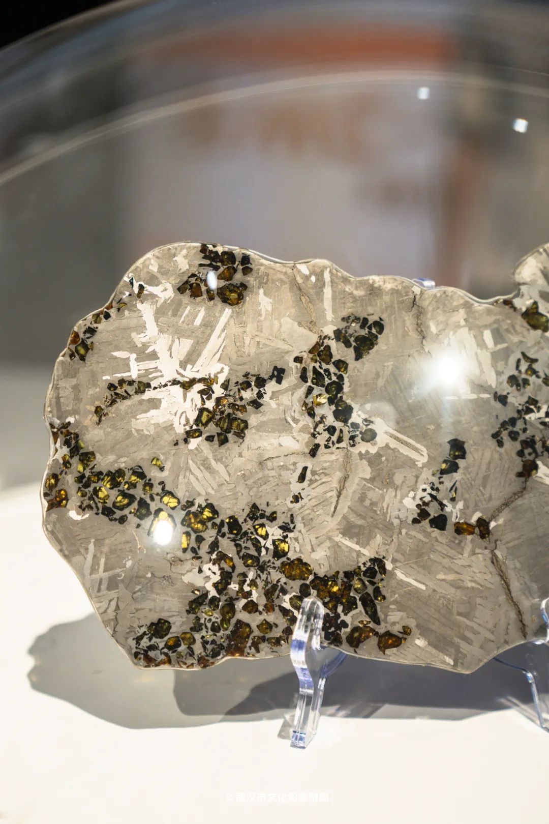 这些陨石几乎和地球同岁,有的经过风化,表面出现了凹凸的形状,像一件艺术品;有的陨石切片透过光,散发出绚烂的色彩