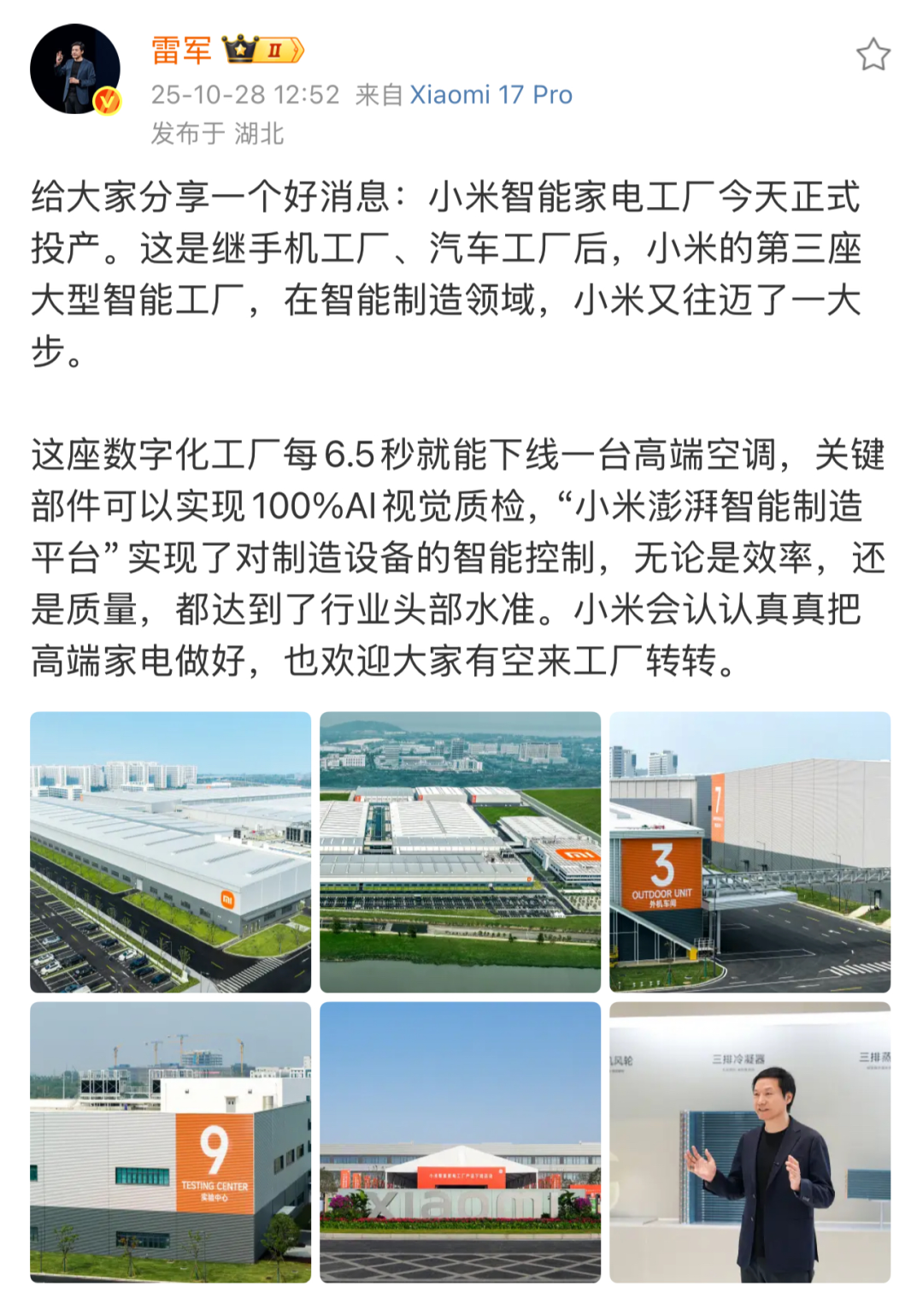雷军在社交平台分享小米智能家电工厂投产信息
