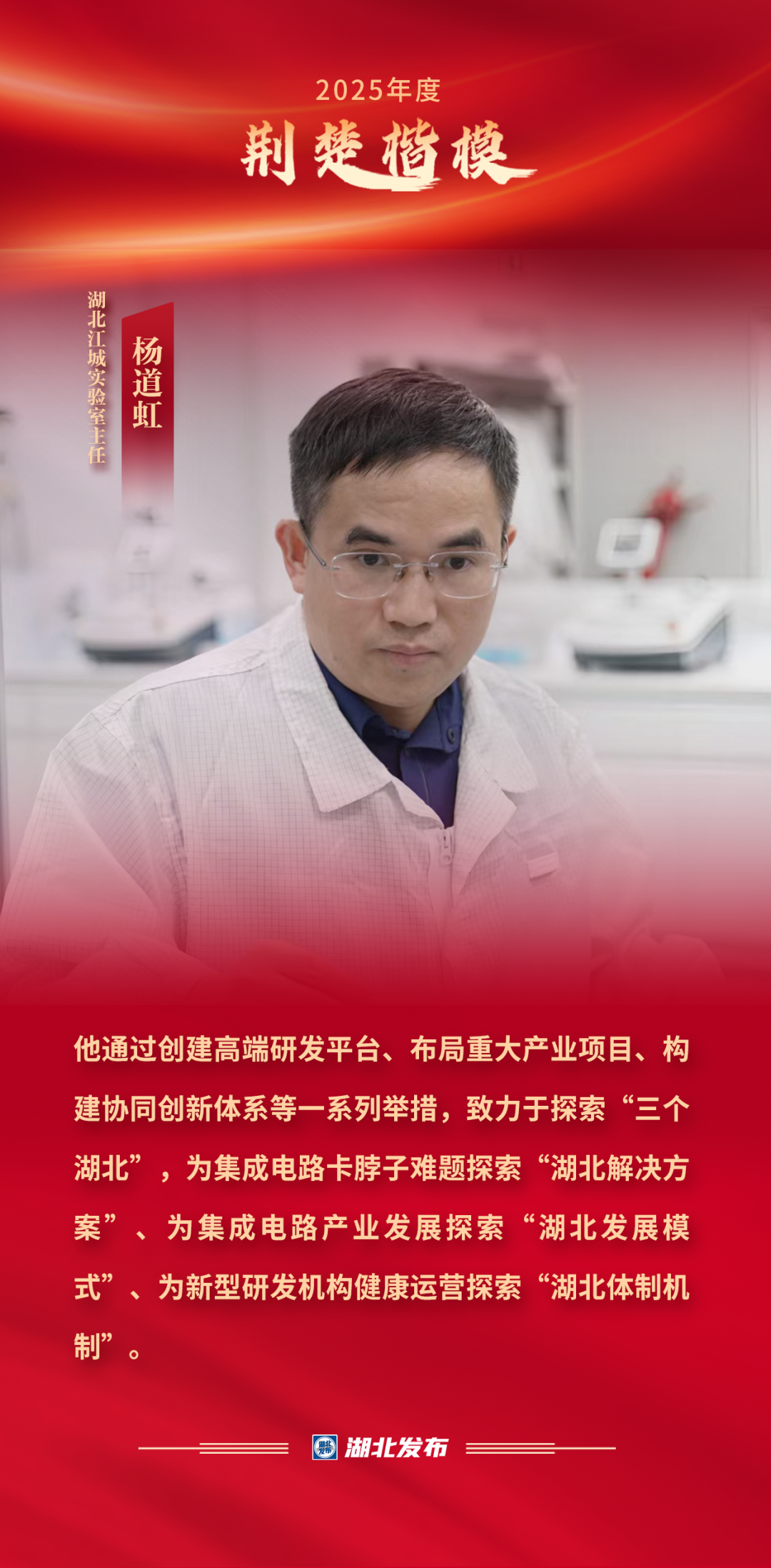 作为国家高层次科技领军人才,杨道虹深耕集成电路技术创新研究,牵头创建江城实验室,建成国内首个先进封装综合实验平台,攻克多项“卡脖子”技术,累计科研收入8.7亿元,成为湖北首个“自我造血”的实验室。作为产业领航者,他推动国家存储器基地等重大项目落地,助力湖北跻身世界存储芯片第一梯队;创新“实验室+实体化平台”运营模式,以实干为加快支点建设注入“芯”动力,为破解集成电路卡脖子难题探索“湖北解决方案”。