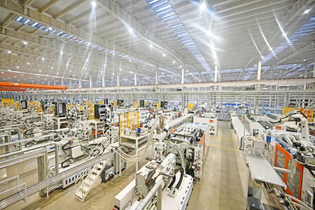 注塑车间内,一台台机械臂自主挥舞。卢伟冰说:“这就是‘黑灯工厂’,高度自动化、无需人工操作。”单联瑜解释,注塑车间负责生产空调内机外壳和结构件,由24台注塑机与37台机器人完成工作。注塑是指塑料粒子通过高温融化成液态后注入模具,受到上千吨的压力压铸成型、冷却脱模,整个过程40余秒,成型的外壳尺寸精度在0.05毫米内。