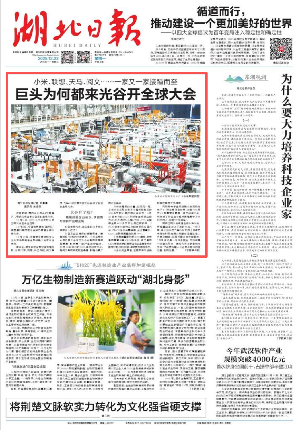 12月22日,湖北日报头版头条刊发报道《小米、联想、天马、阅文……一家又一家接踵而至 巨头为何都来光谷开全球大会》,以下为全文转载。