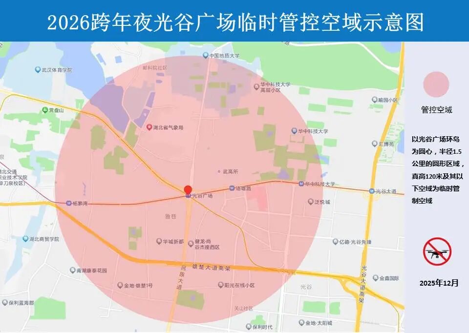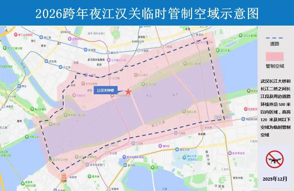 为维护“星光映万家——2026璀璨长江·武汉跨年光影秀”活动相关区域低空安全,日前,武汉公安发布《关于增加无人驾驶航空器临时管制空域的通告》,将对我市部分区域进行临时性空域管制,相关事项通告如下: