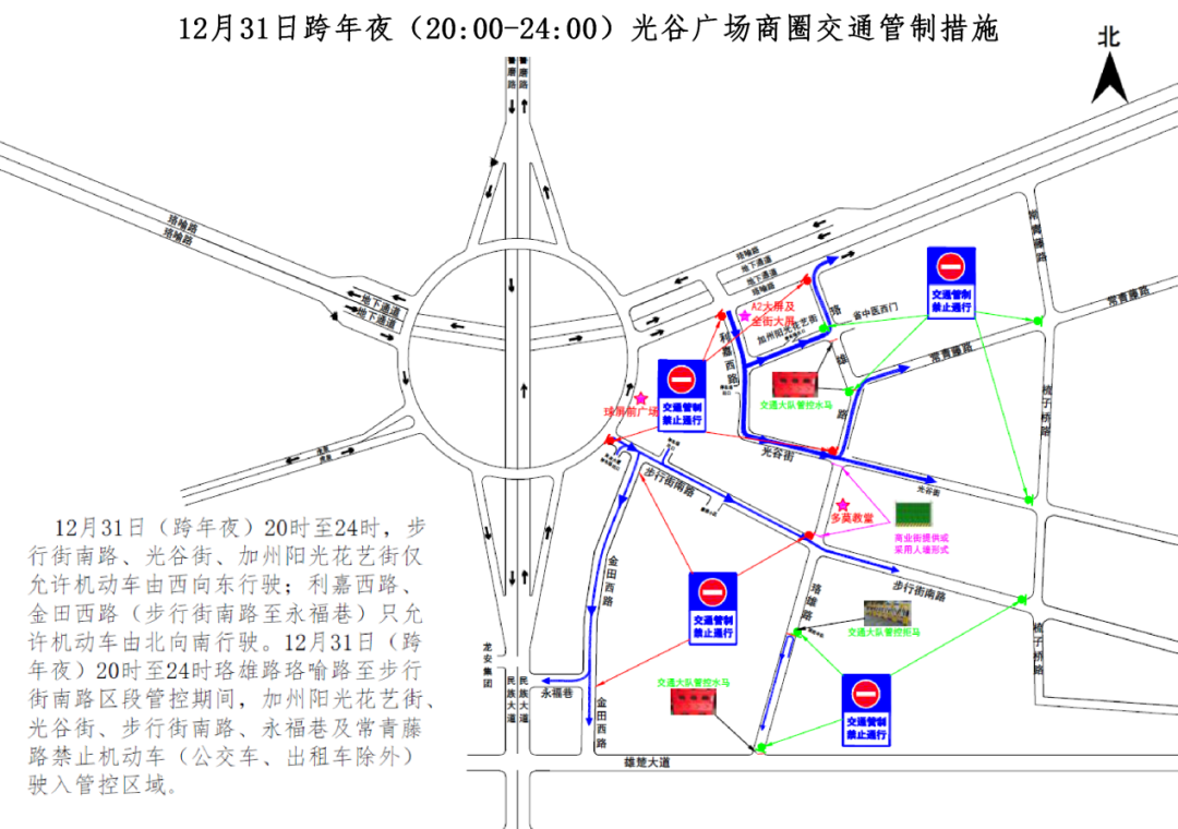 从12月31日20:00起,部分道路启动单向通行管控,保障车流有序流动,减少交通拥堵。其中步行街南路、光谷街、加州阳光花艺街,仅允许由西向东行驶;利嘉西路、金田西路(步行街南路至永福巷段)仅允许由北向南行驶。过往车辆请严格按照交通标志指示通行,切勿逆行或违规变道。