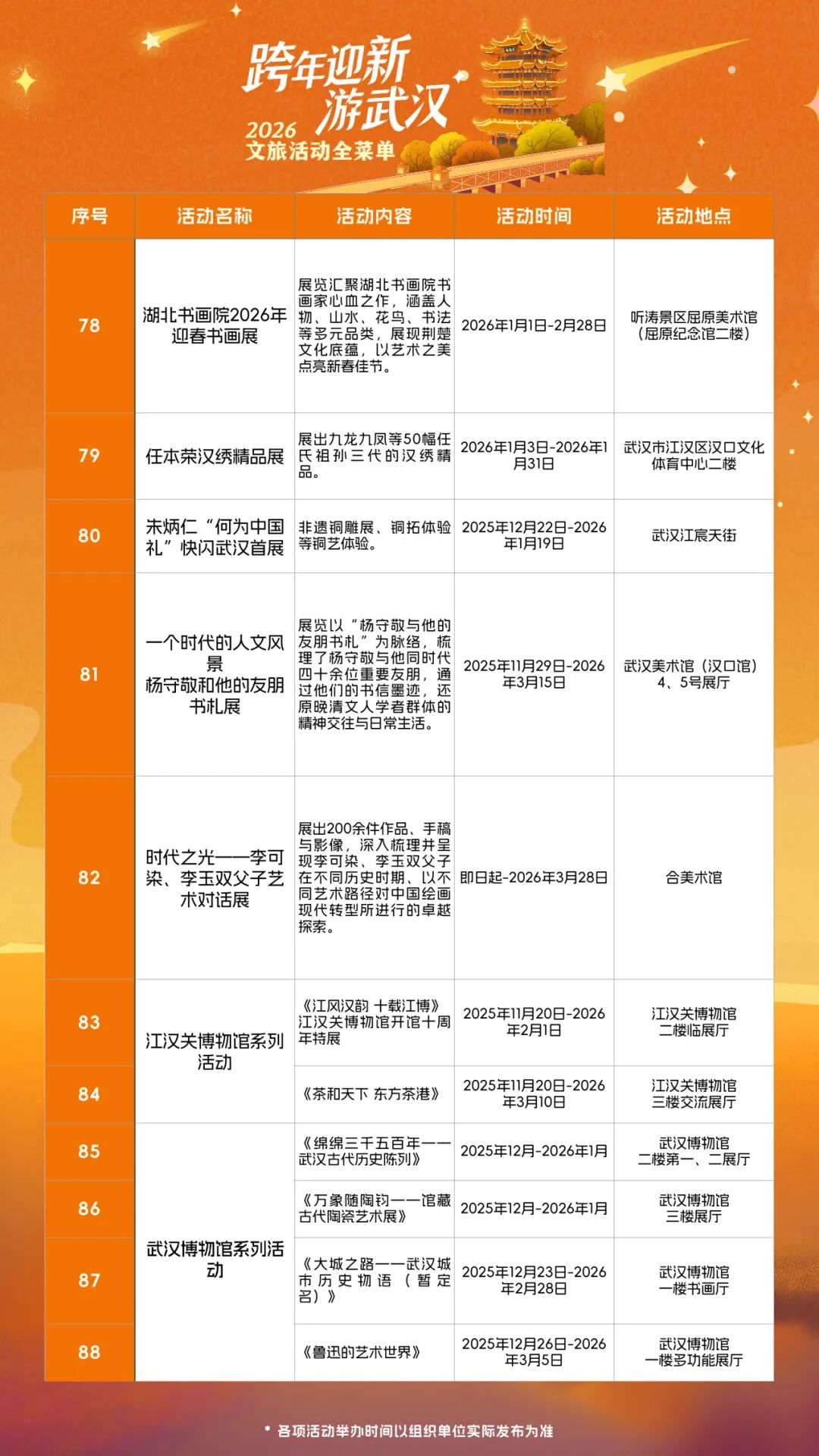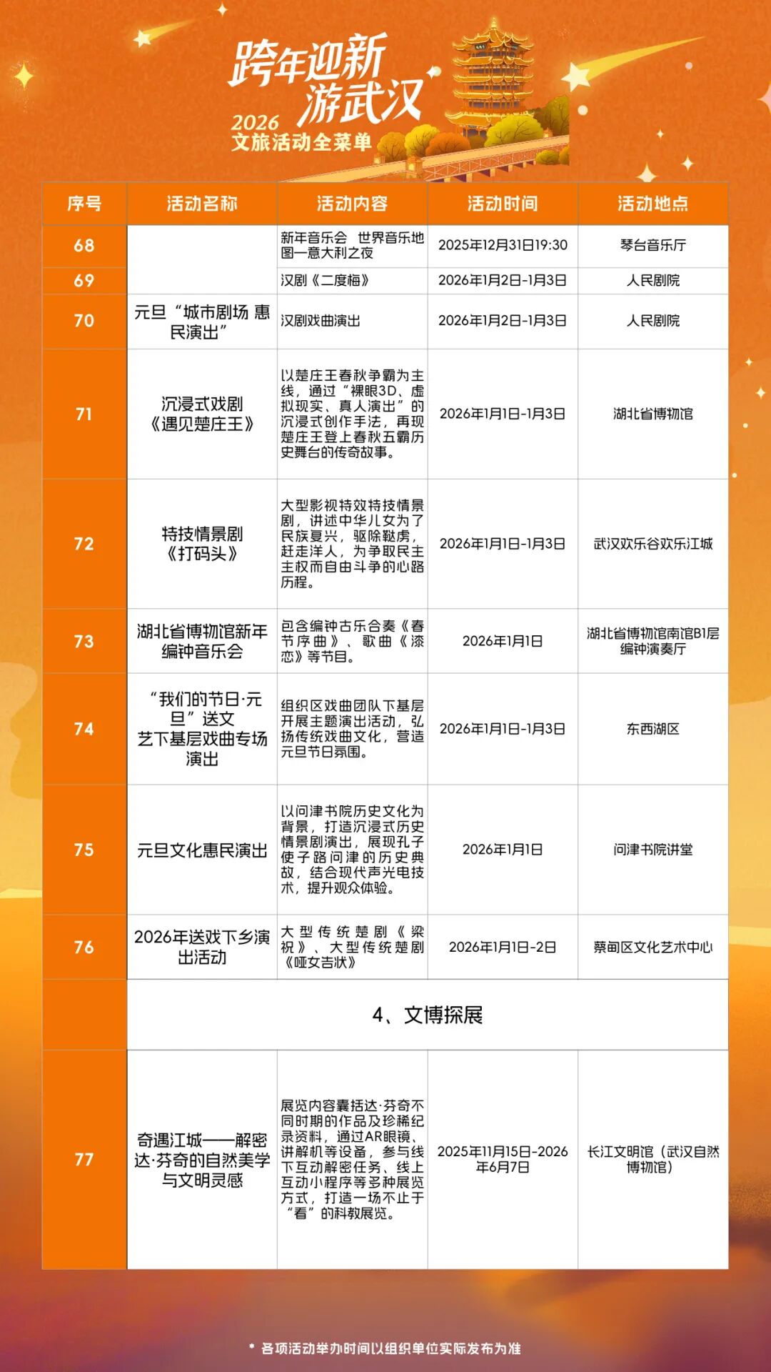 2026年元旦期间,武汉以“跨年迎新游武汉”为主题,官宣120多项丰富的文旅玩法,为市民、游客奉献一场精彩纷呈的文旅盛宴。