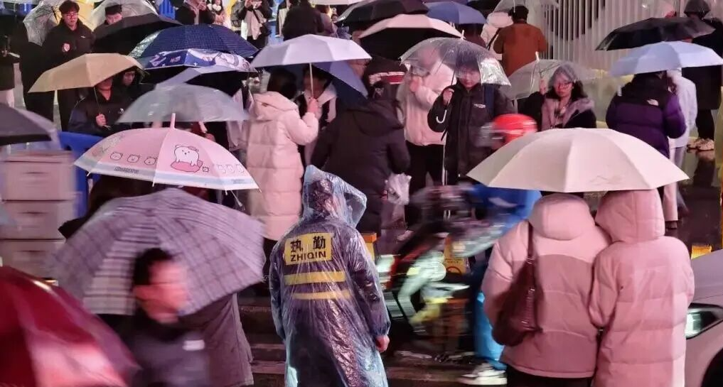 雨中执勤人员有序疏导人流,守护跨年夜温暖