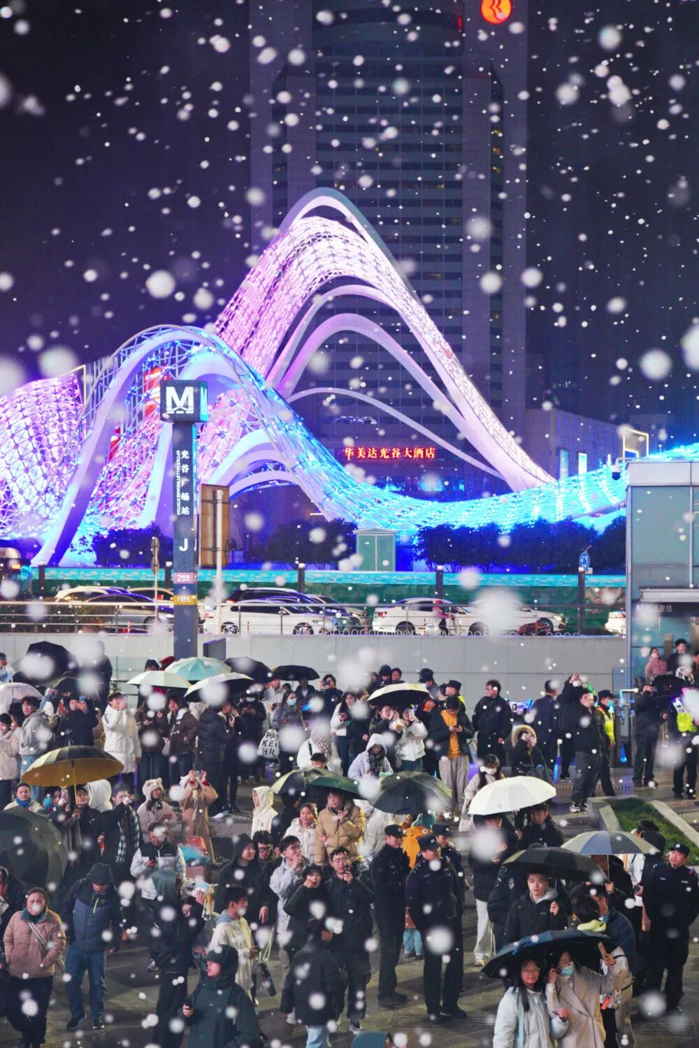 今晚正值武汉市大风降温雨雪天气过程,东湖高新区公安、城管、环卫、供电等各战线工作人员全程守护,巡逻执勤、站岗守卡、路面保畅……致力于为市民游客留下一个难忘而平安的迎新之夜。