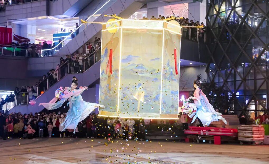 在世界城光谷步行街,喷泉广场与柏林广场轮番上演飞天表演,“财神”与“仙女”翩然而至,为新老游客送上祝福,街区多家热门店铺门口排起长队。在12月31日跨年夜,步行街人流量达34.38万人。