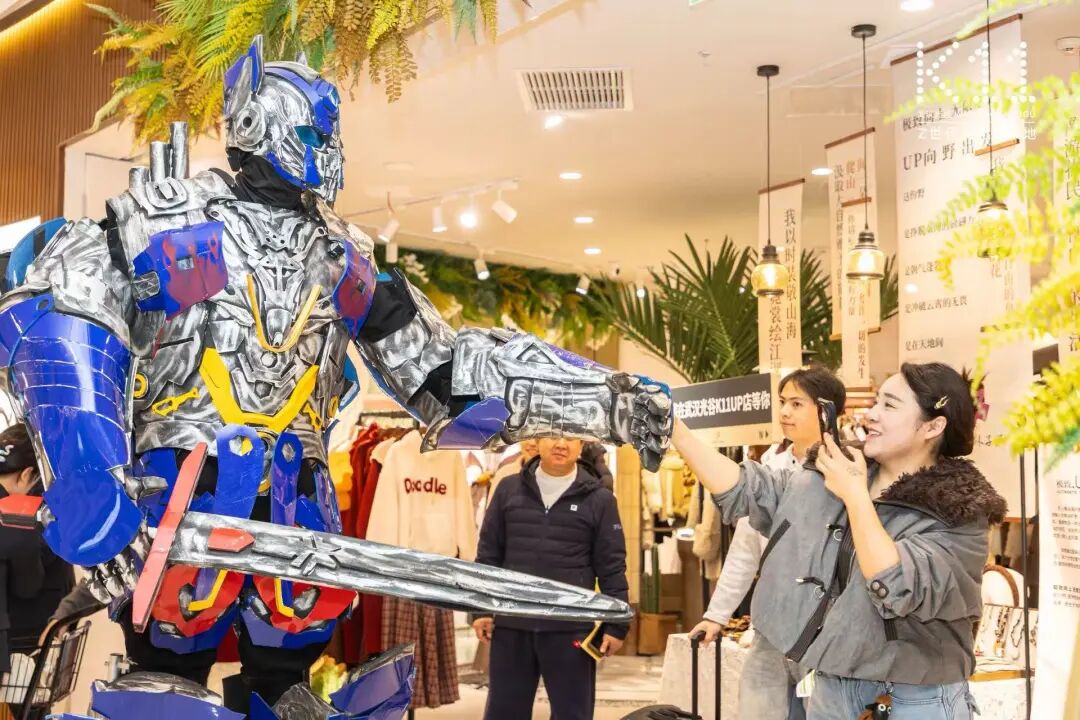 武汉光谷K11同样人气十足,两台赛博机甲炫酷登场,配合COSER巡游互动,引得不少年轻人、小朋友拍照打卡;王一博粉丝应援活动更引来数百人参与,人潮涌动。