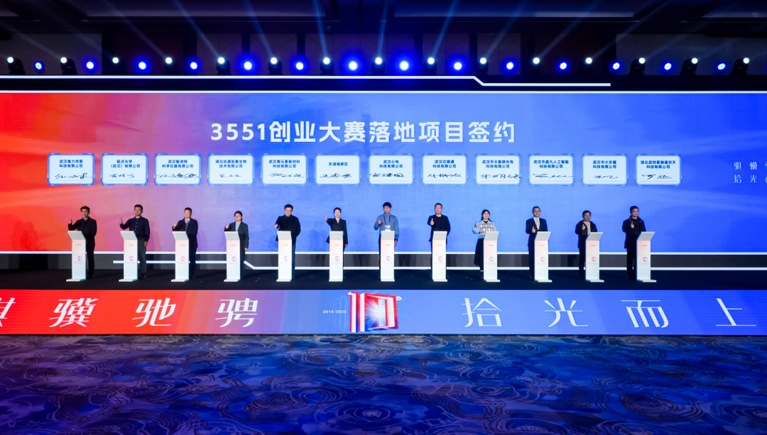 现场,还有武汉心电科技有限公司等11个3551创业大赛项目团队与东湖高新区签约,落地光谷进一步推动产业化。