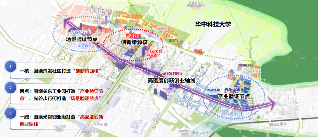 目前,在珞喻路、关东园路、雄楚大道和民族大道的围合区域,光谷正在建设面积4平方公里的“环华科大创新发展带”,打造“世界级科创街区”。