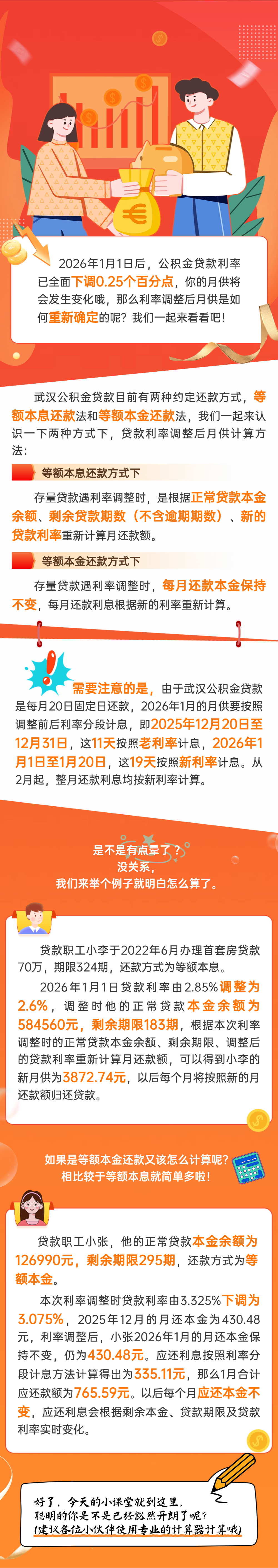 2026年1月1日后,公积金贷款利率已全面下调0.25个百分点,利率调整后,你知道你的月供该如何计算吗?“武汉公积金”微信公众号日前发布相关提示。一起来看~