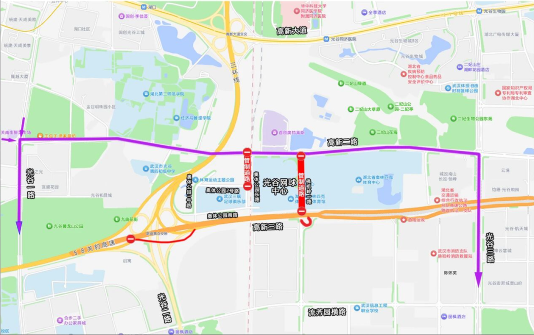 三环线高新二路出口匝道(光谷大道立交至新武黄立交段)临时封闭(前往足球训练基地车辆视情况放行)。