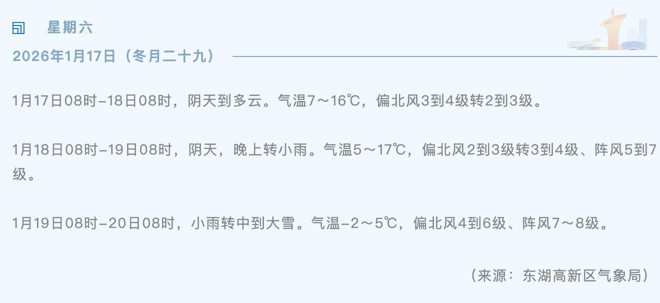 2026年首场寒潮已“发货”,东湖高新区气象局提醒您,预计1月18日夜间至22日,受地面强冷空气影响,我区将有一次寒潮大风和低温雨雪冰冻天气过程。其中18日夜间至19日白天小雨,19日夜间转中到大雪,20日至21日小雪,22日零星小雪转阴天。