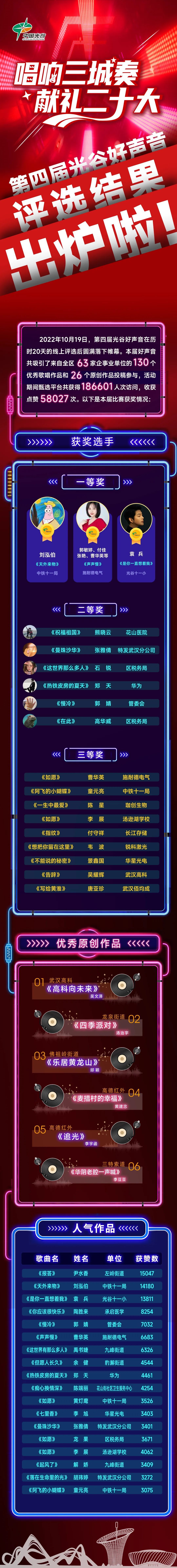 目前,主办方已邀请18位获奖选手参与录制第4届“光谷好声音”原创主题曲,即将发布。