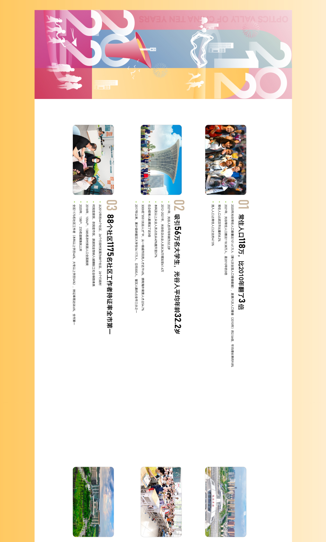 “产城融合,具有国际吸引力的科技新城”部分,展示了光谷如何从从“一束光”到“一座城”,成为一座创新人才加速集聚,高学历人群不断涌入的宜业宜居的科技新城。十年间,光谷常住人口达到118万,在校(园)生数均增长了3倍,在企从业人员数量翻了近1倍,光谷人的平均年龄32.2岁。