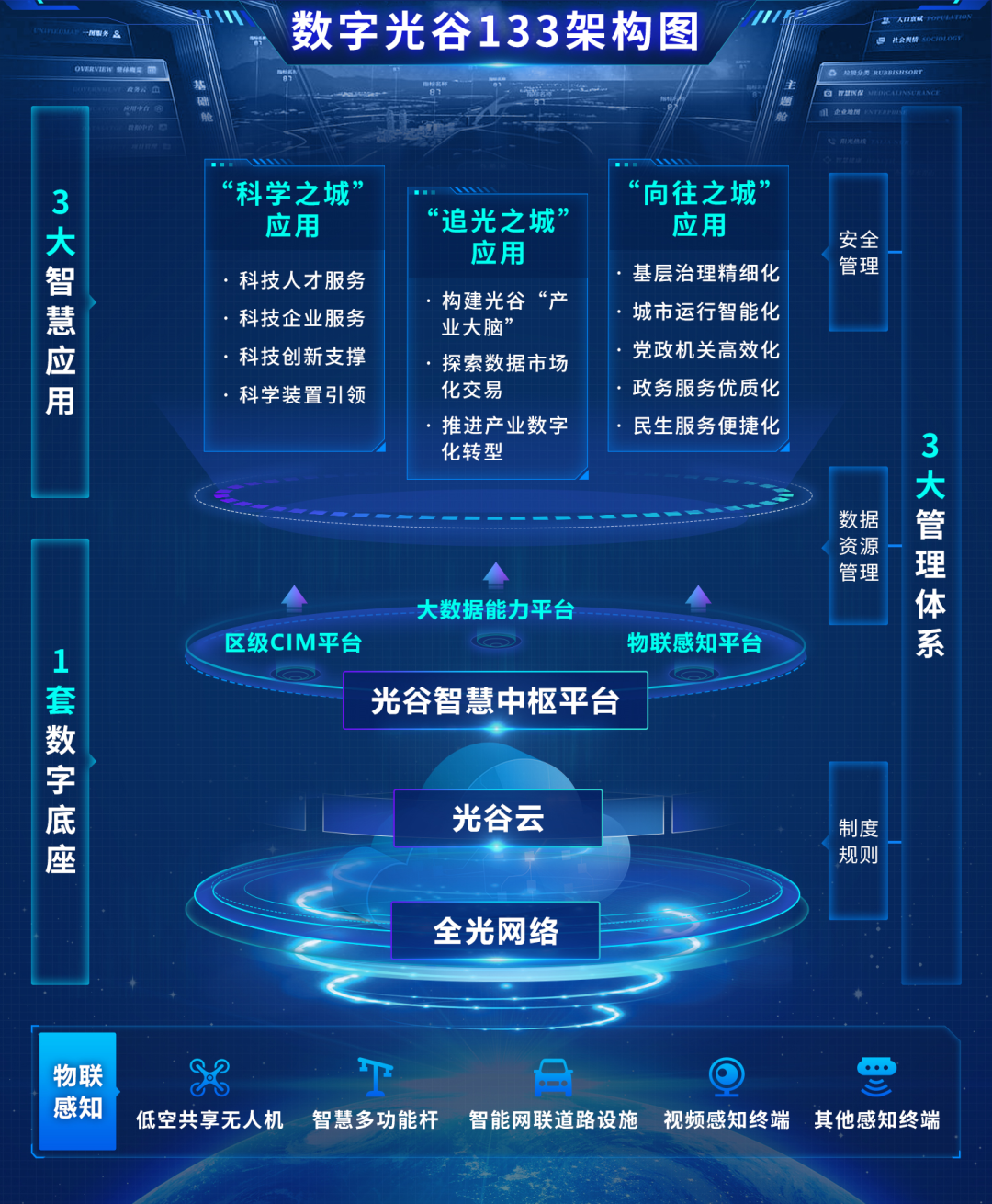 《方案》提出,未来3年,东湖高新区将形成“133”框架体系推进“数字光谷”建设:即统筹智能终端、全光网络、光谷云、智慧中枢等建设,打造一套“数字底座”;聚焦科技创新、产业发展、城市运行数字化,推进“科学之城”、“追光之城”、“向往之城”三大智慧应用建设;建立安全管理、数据资源管理、数字化管理制度规则三大管理体系,保障数字政府稳健运行。