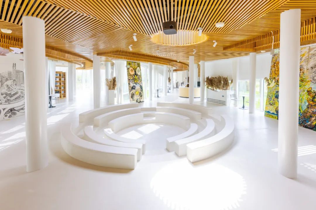 空中俯瞰,建筑形态类似“人文”两个汉字,5个白色弧形的玻璃盒子相互穿插链接,建筑风格简约现代。白天,阳光可透过屋顶天窗,照在书架上;夜间,月光从天窗中透入。