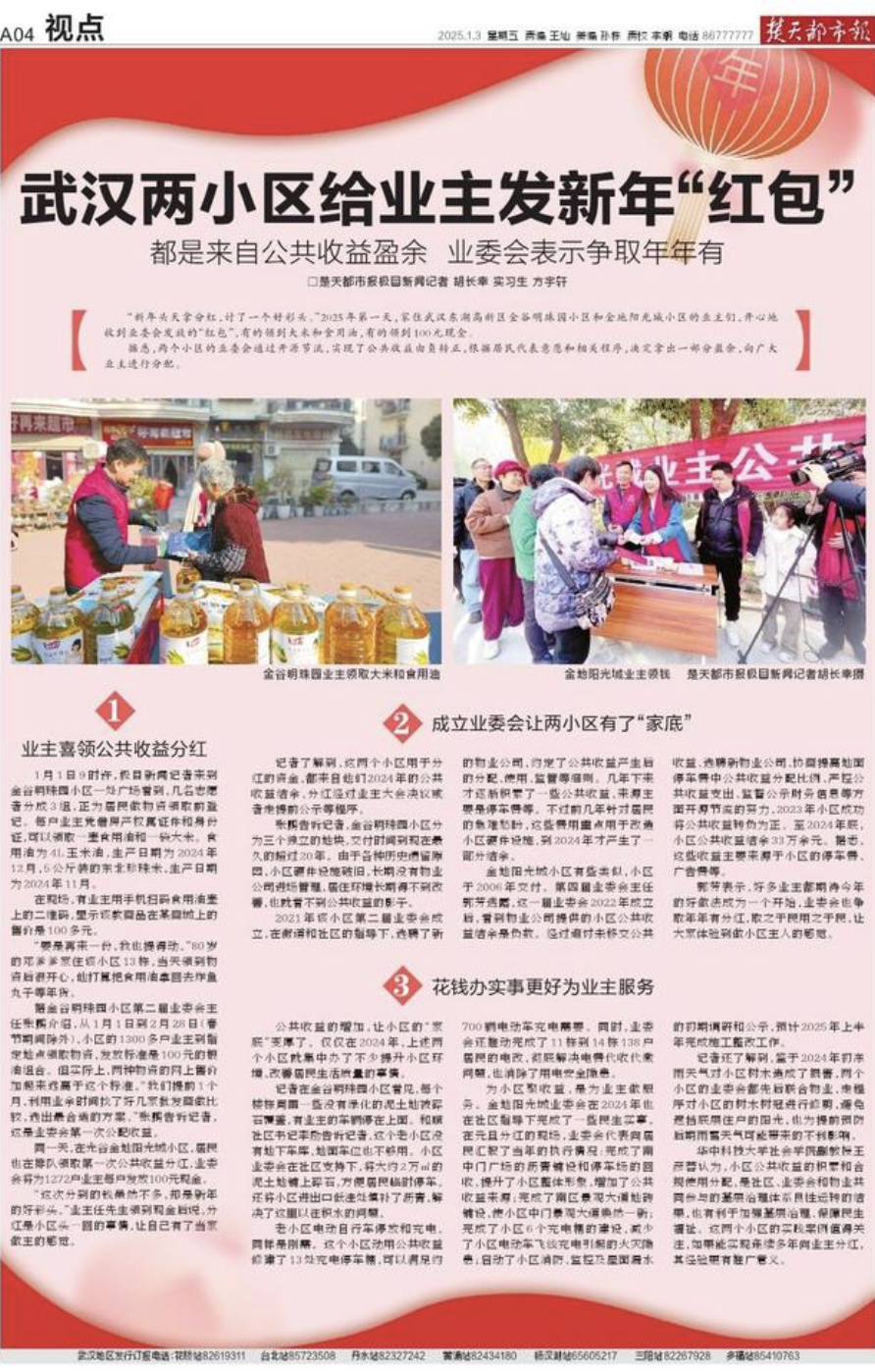 1月3日,楚天都市报整版报道《武汉两小区给业主发新年“红包”》金谷明珠园小区分为三个独立的地块,交付时间到现在最久的超过20年。2021年该小区第二届业委会成立,在街道和社区的指导下,选聘了新的物业公司,约定了公共收益产生后的分配、使用、监管等细则。第二届业委会主任张鹏介绍,前几年针对居民的急难愁盼,这些费用重点用于改造小区硬件设施,到2024年才产生了一部分结余。