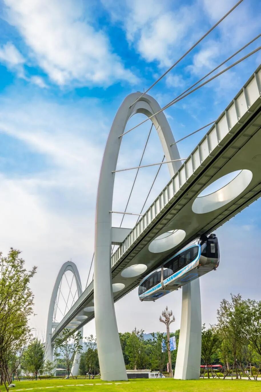 新一代智能悬挂式单轨列车是一种新型轨道交通方式,其轨道借助钢结构立柱架设于空中,列车车体则悬挂于轨道梁下运行,将地面交通移至空中,拥有独立路权,不受地面其他交通工具和行人干扰,是一种绿色低碳的城市轨道交通新制式。