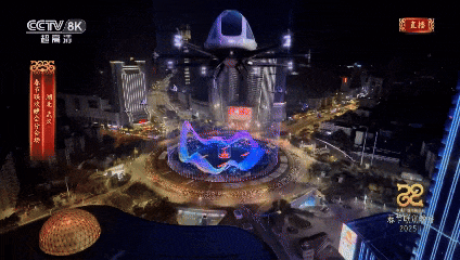 今年春晚,光谷广场作为武汉分会场首个镜头亮相,它被誉为亚洲最大的立体交通枢纽中心,其主体为直径200米的圆形转盘。中间的“星河”雕塑,是中国国内体量最大的钢结构公共艺术品,以其独特的圆形设计和36米单拱跨度,象征着武汉的山水交融之美。雕塑上有近两万盏灯,照亮了光谷广场的夜空,远远看去似翻腾起伏的龙、也如蜿蜒奔流的江河。
