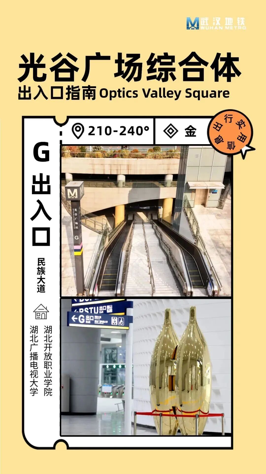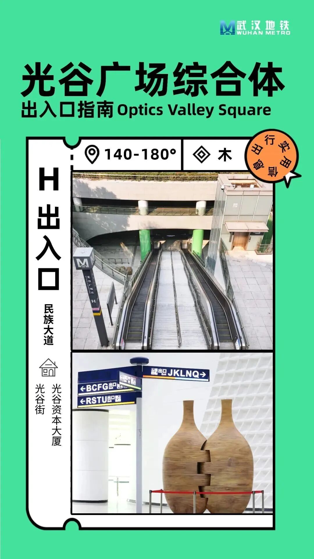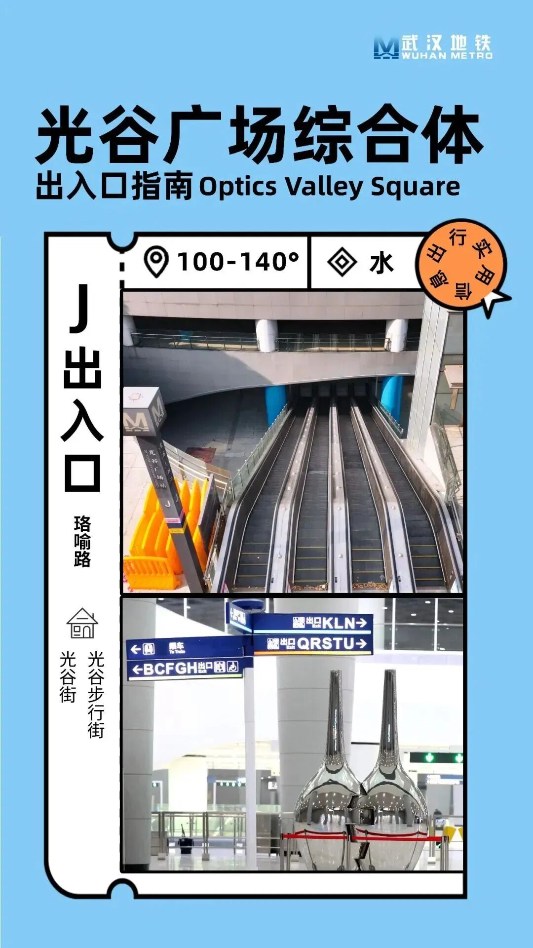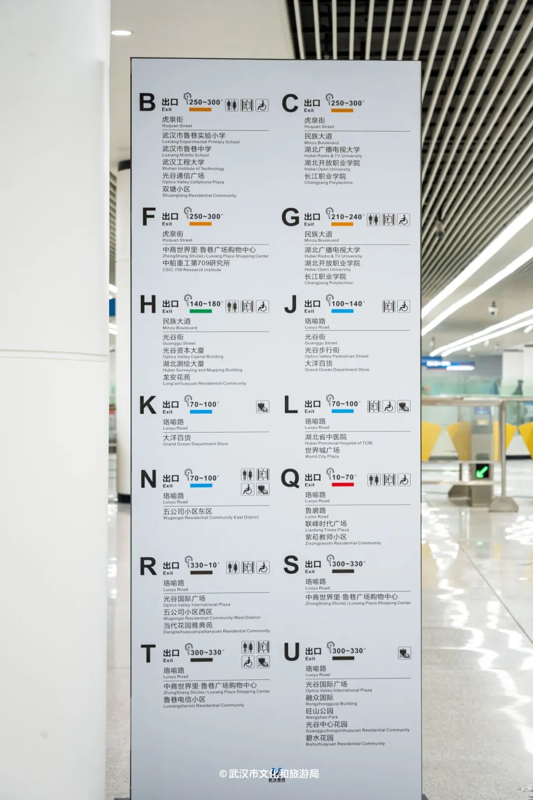 光谷广场站整体呈圆形布局,传统的‘左转’或‘右转’指引方式在这里并不适用。该站指引标牌上标注了0°至359°的角度范围,其中0度为正北方向。乘客可根据目标方向查找相应的度数范围,快速找到出口。例如,若乘客需要从L出口出站,可找到标注为“70°-100°”的区域,沿着地面指引线前行,即可到达目的地。
