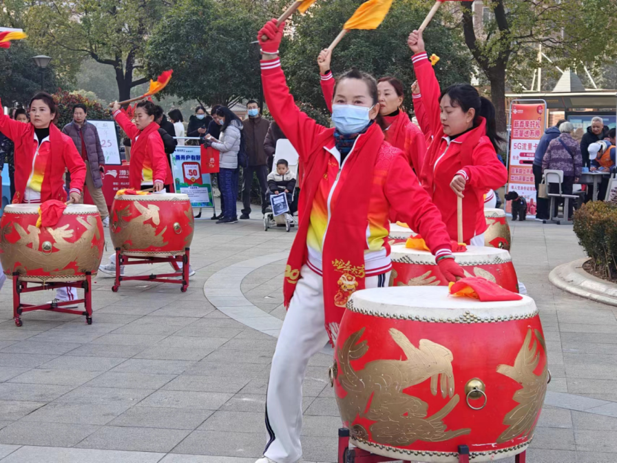 关东街道各社区春节活动也陆续开展。其中,梧桐苑社区举办了新春庙会,舞狮者身着红金传统服饰,欢腾表演并送上新春对联;长山社区腰鼓队带来了舞鼓表演,引得居民们频频喝彩。