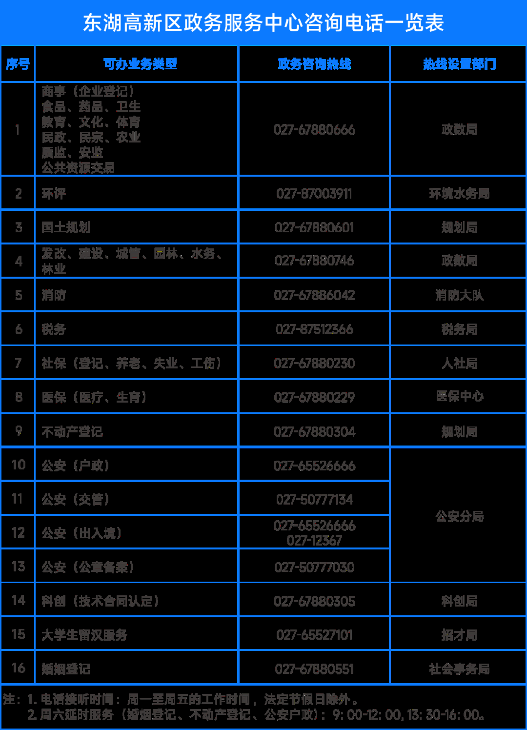1、工作日:上午9:00-12:00 下午13:30-17:00(法定节假日除外)。2、周六延时服务:上午9:00-12:00,下午13:30-16:00。延时窗口含社保、医保、不动产、婚姻登记、公安户政、交管、公安出入境(注意出入境仅上午9:00-12:00),具体可办业务以光谷政务微信公众号可预约事项为准。