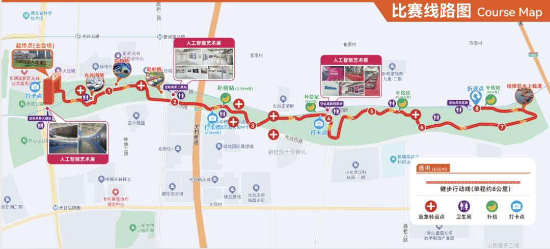 起止点为logo广场,沿途经光谷中央生态大走廊、光谷书房、中国光谷人工智能艺术大展、跨境购物商场等,一步一景,随处皆可入画。