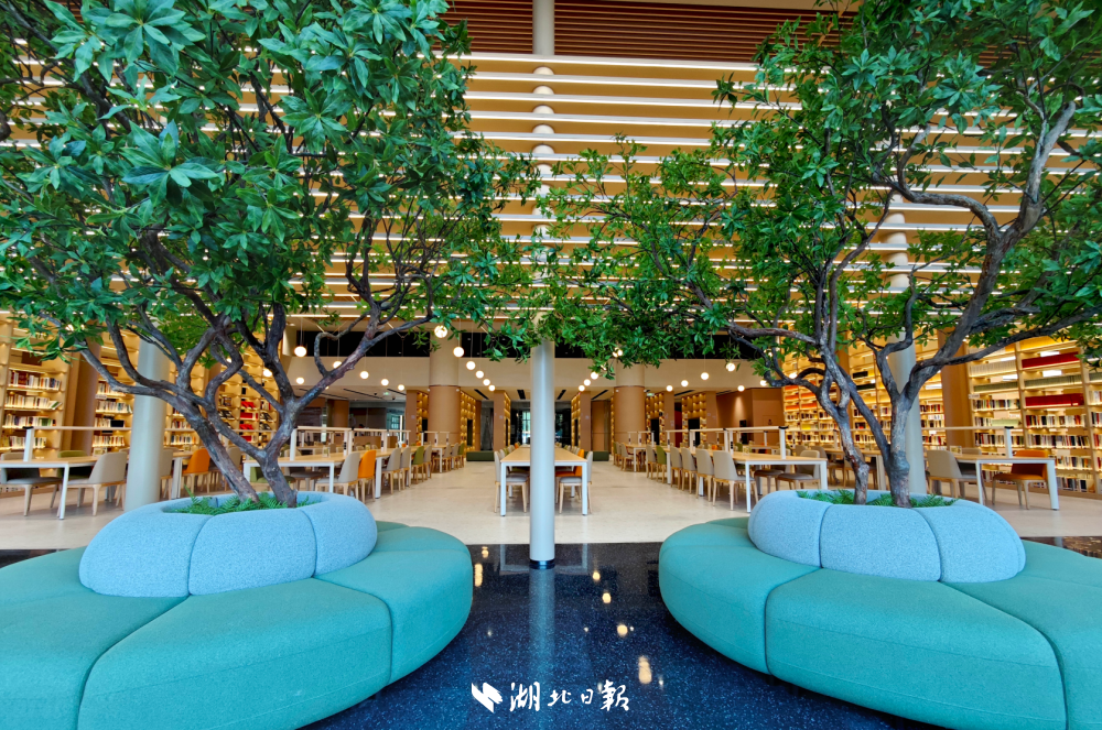 紧邻玻璃幕墙摆上4棵高达4米的仿真绿树沙发环绕捧上一本好书,在沙发上静静阅读成为不少网友打卡的理由