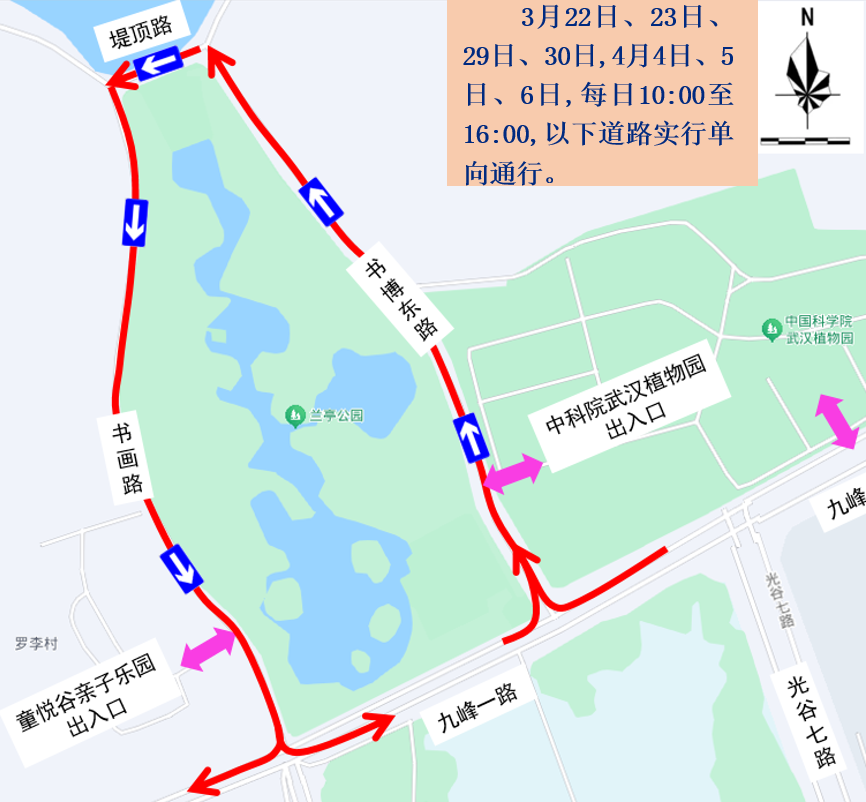 1.书博东路、堤顶路、书画路合围区域机动车通行一律经九峰一路书博东路路口进,九峰一路书画路路口出;