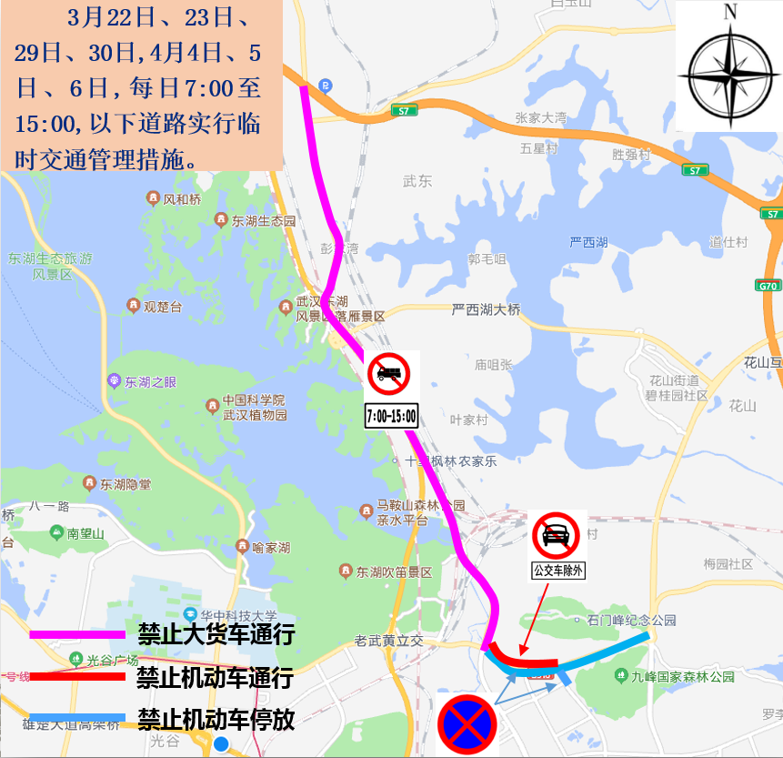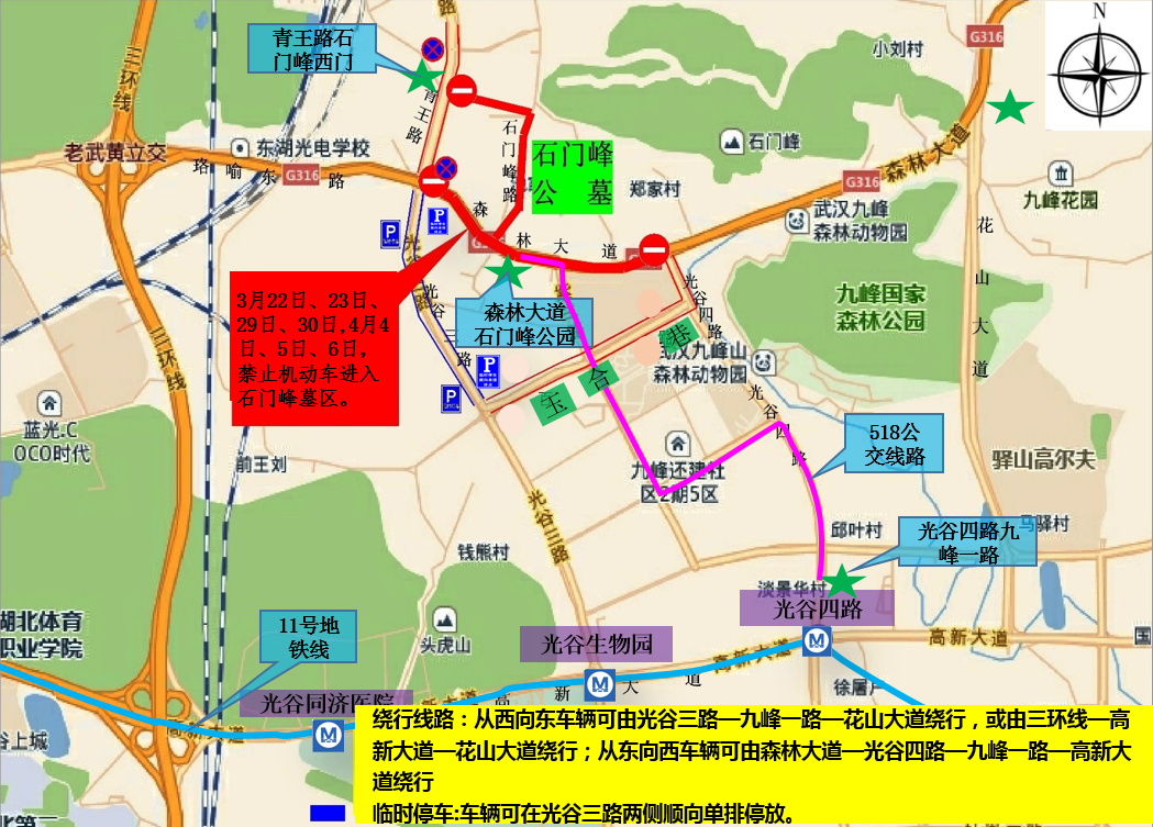 祭扫期间,预计周边道路车流量将明显增多,为保障道路交通安全、有序,光谷交警将视情况对墓区周边部分道路实施临时交通管理措施,具体安排如下。
