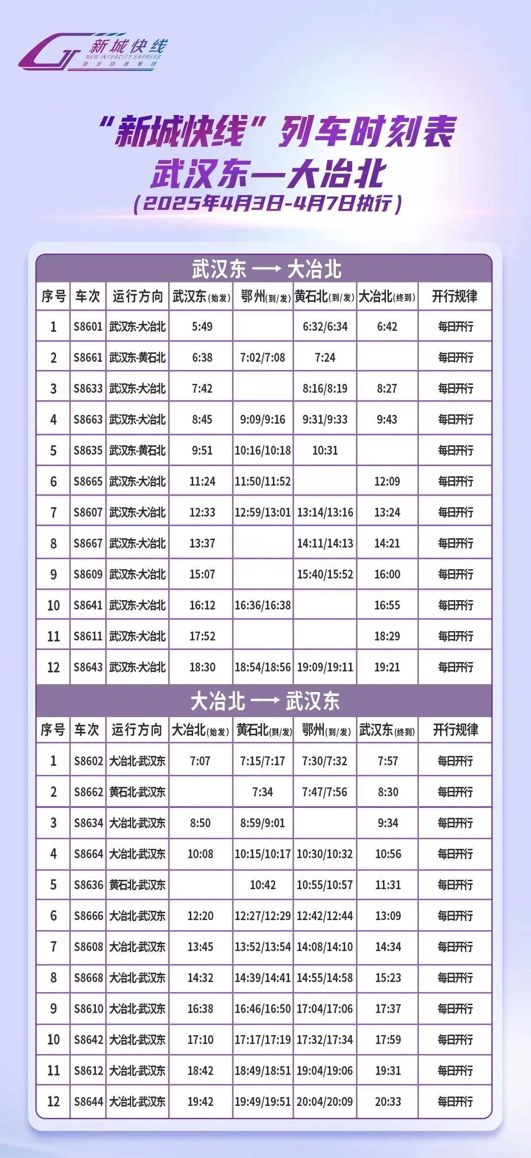 2025年清明节假期运输期限为4月3日至7日共计5天,“新城快线”列车将按45列/日开行。列车开行时刻表如下: