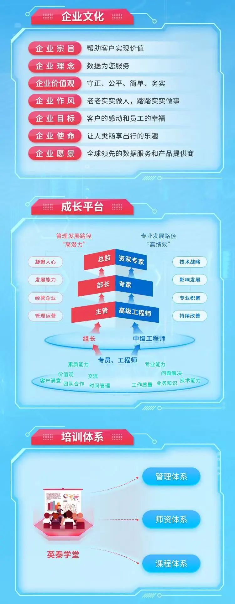 提供技术、管理、市场等多条晋升通道,支持横向调岗和网状晋升。