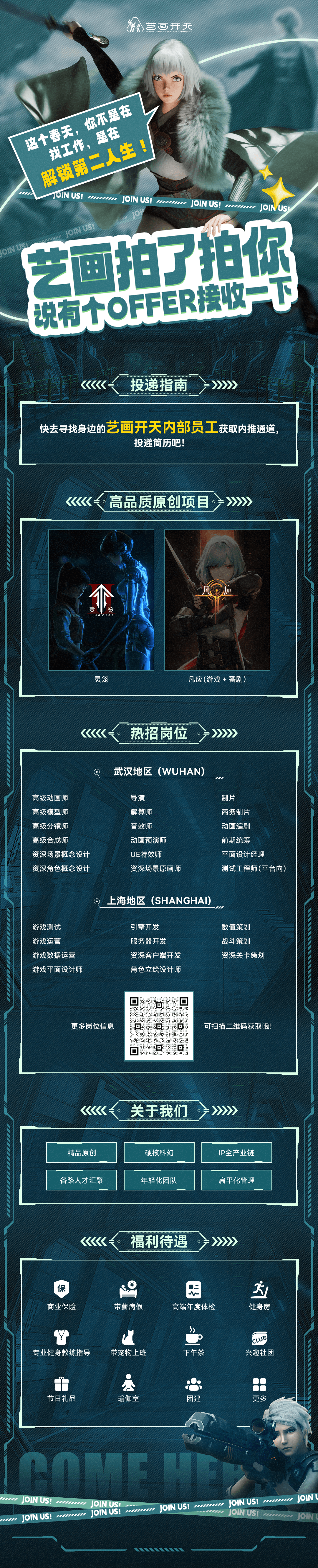 武汉艺画开天文化传播有限公司是一家致力于打造精品原创"动漫+游戏"IP,具备全产业链运营能力的数字文娱公司。公司代表作品:原创动画IP作品《灵笼》在B站播放量超6.6亿,追番人数超900万,全网传播破百亿次,全网粉丝超2000万,并荣获“金龙奖”"金猴奖”等数十项国家级荣誉。