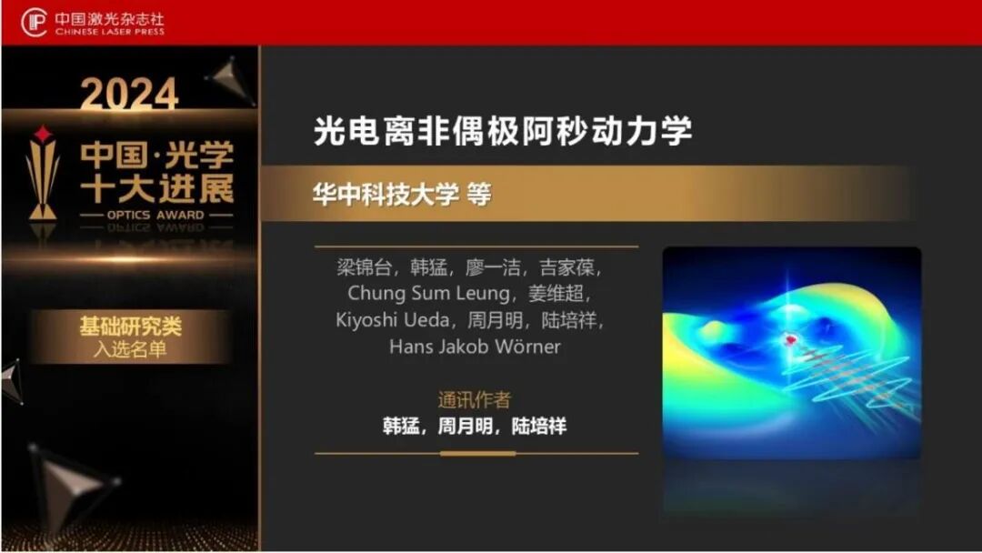 近日,中国激光杂志社发布“2024中国光学十大进展”,华中科技大学团队光电离非偶极阿秒动力学、钙钛矿太阳能电池2项“基础研究类”成果入选,“训算一体多模态光学推理芯片”成果获得“应用研究类”提名奖。