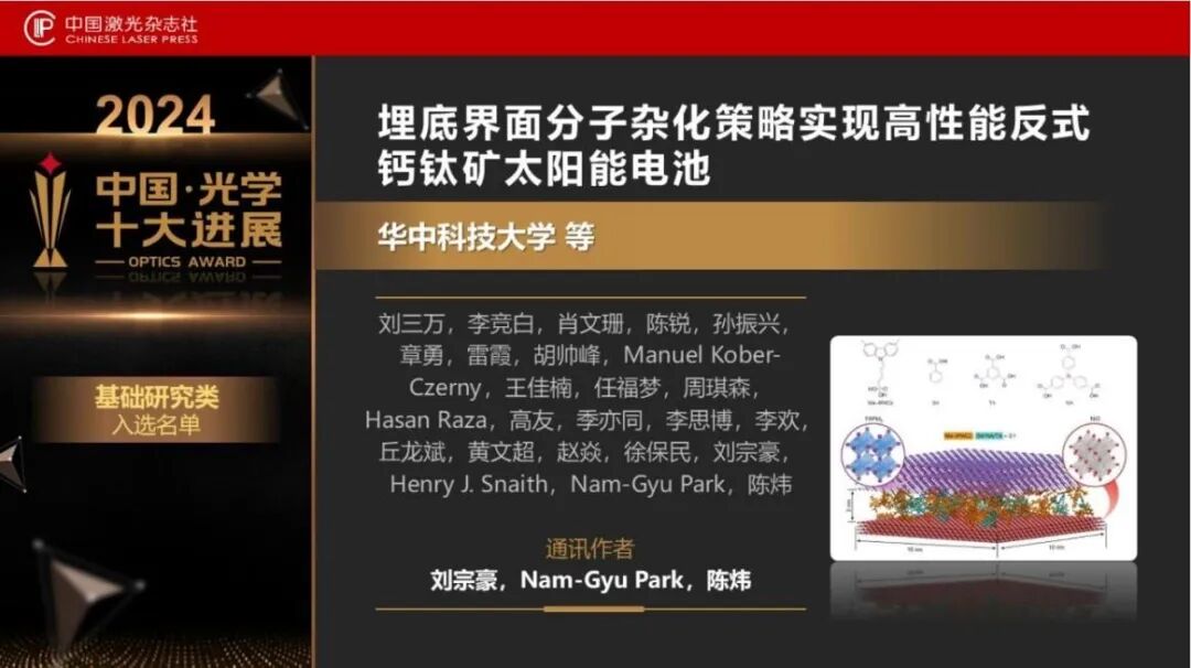 此次陈炜、刘宗豪团队的研发成果——“埋底界面分子杂化策略实现高性能反式钙钛矿太阳能电池”入选“2024中国光学十大进展”(基础研究类),以26.54%的转化效率打破了世界纪录。陈炜介绍:“该成果将在光谷完成中试验证,加快产业化进程。”