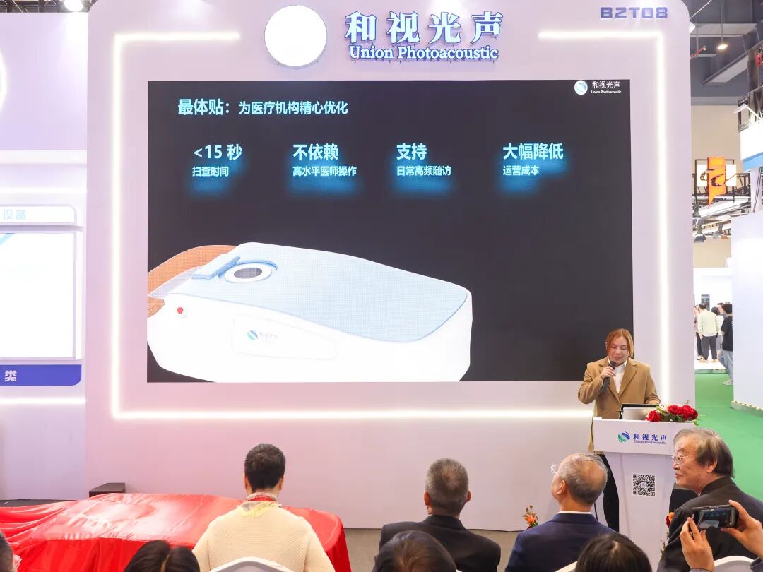 其中,和视光声发布了全球首台全景乳腺光声断层成像系统。公司软件负责人贾文杰博士说:“在乳腺疾病早期检查中,传统超声、X线钼靶、核磁共振等技术存在‘看不清、查不准、费用高’等短板,此次发布的新产品通过实时、无创、高精度地生成360度全景血管结构图像,能够弥补现有传统影像技术的不足,满足大规模乳腺疾病早期筛查的需求。”