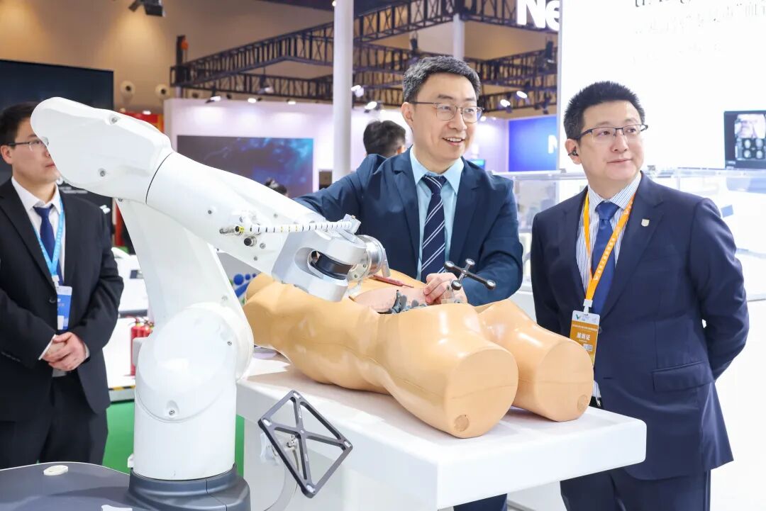 “这是我们最新的脊柱创伤一体化骨科手术机器人。”联影智融骨科科研合作负责人介绍,这台机器人能在术前形成智能决策、术中精准导航定位,未来将成为骨科医生的得力助手。此外,在联影集团展位,还有“元智”医疗大模型、智能体,智慧心血管慢病管理整体解决方案等多款数智化创新成果亮相。