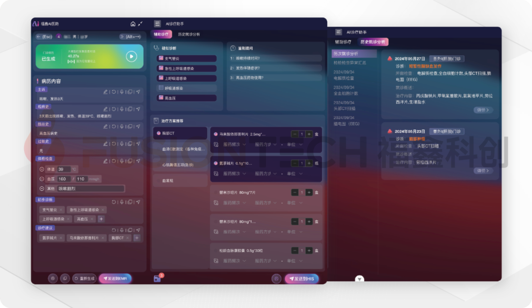 这款AI生成式电子病历,不仅能够精准识别普通话,还能支持全国23种方言,哪怕患者因为紧张、病情等原因表达得“前言不搭后语”,它也能精准捕捉关键信息,完整、准确地记录下整个问诊过程;还会给医生提供诊断建议、处方建议、检验检查建议等。