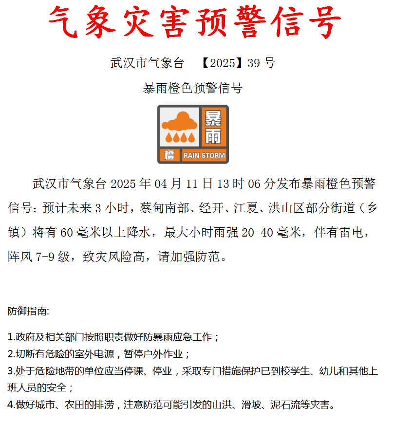 预计今天下午,蔡甸南部、武汉经开区、江夏、洪山区部分街道(乡镇)将有60毫米以上降水,最大小时雨强20-40毫米,伴有雷电,阵风7-9级,致灾风险高,提醒大家加强防范。