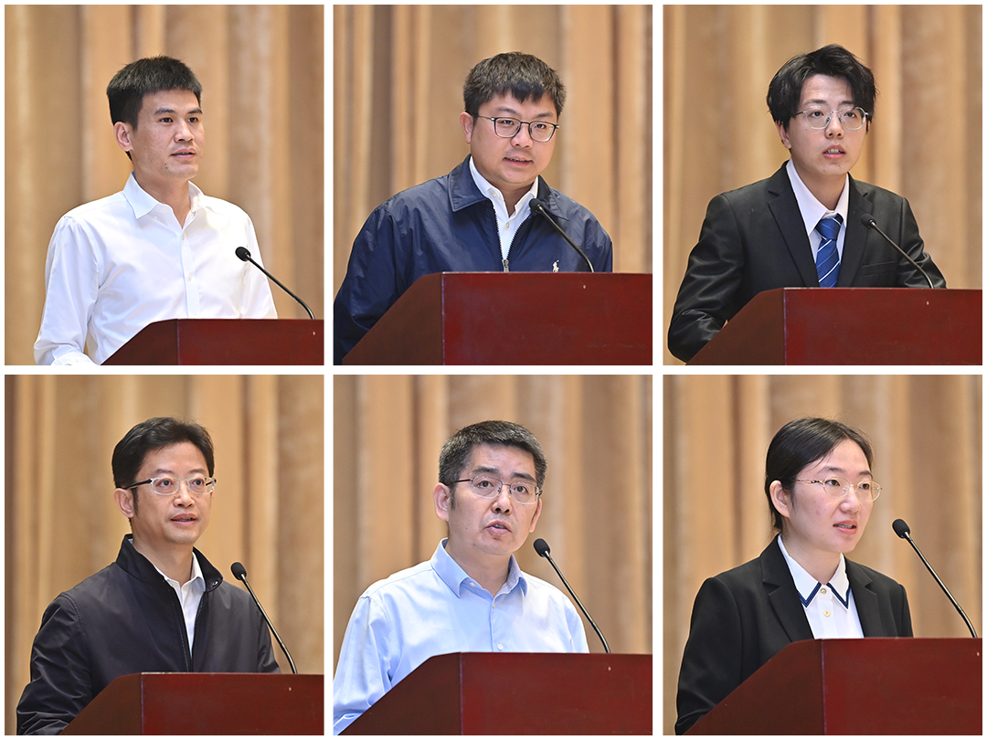 民营企业代表现场发言。第一排从左往右分别是:九州通医药集团股份有限公司董事长刘长云、武汉市聚芯微电子有限责任公司董事长刘德珩、武汉模态跃迁科技有限公司CEO邴龙志,第二排从左往右分别是:武汉嘉晨电子技术股份有限公司董事长张劲,芯擎科技武汉公司总经理、湖北芯擎科技有限公司副总裁汪子元,武汉科前生物股份有限公司董事长陈慕琳