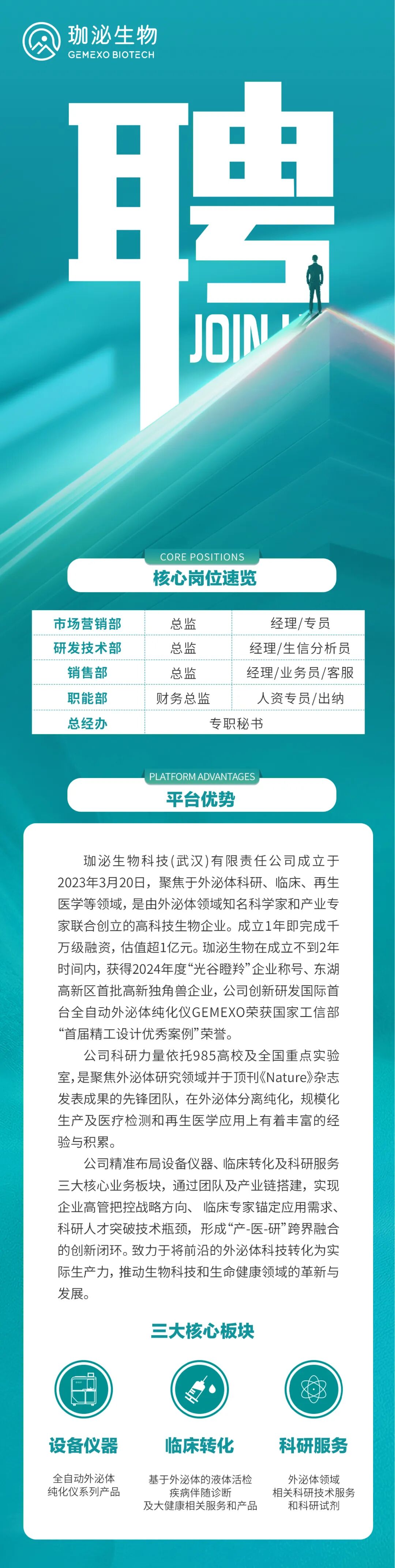 珈泌生物科技(武汉)有限责任公司是一家由外泌体领域知名科学家和产业专家联合创立的高科技生物企业。曾获评2024年度“光谷瞪羚”企业、东湖高新区首批高新独角兽企业;公司创新研发国际首台全自动外泌体纯化仪GEMEXO荣获国家工信部“首届精工设计优秀案例”荣誉。