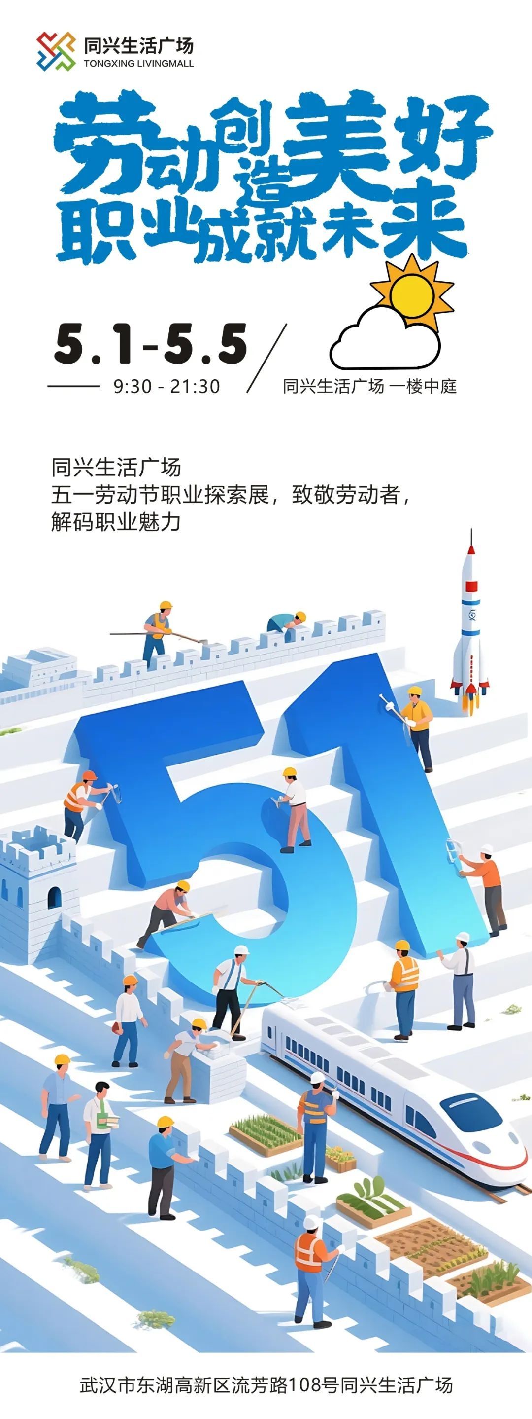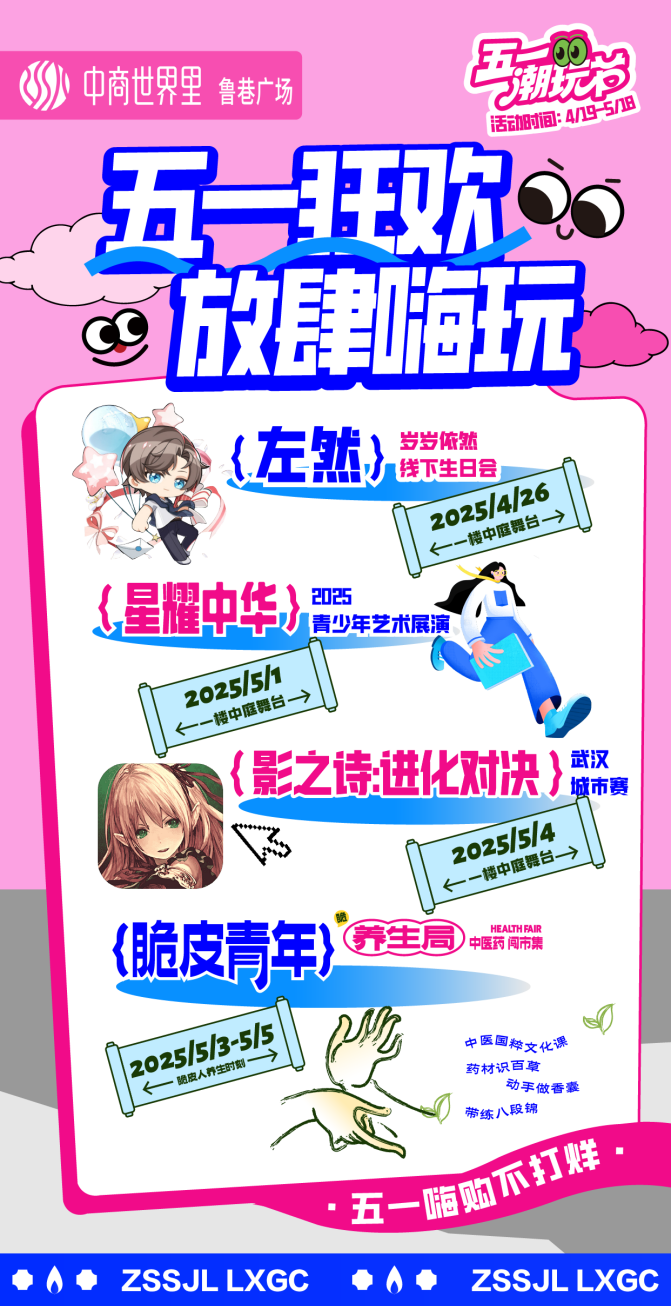 ????活动:(1)5月1日10:00-18:00,《星耀中华2025青少年艺术综合展演》;(2)5月3日-5日,脆皮青年养生市集:现场名医免费把脉,教学中医耳穴疗法,缓解失眠多梦,还有八段锦专业带练,中医香囊DIY,小小李时珍少儿研学等活动,带你感受中医国粹文化。(3)5月4日,《影之诗:进化对决》2025年城市赛武汉站。