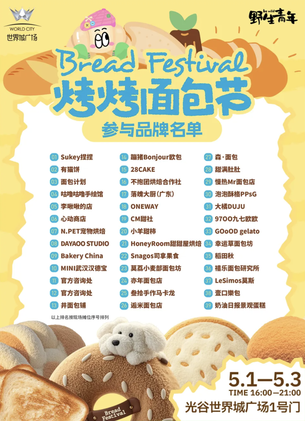 ????活动:面包脑袋看过来!超20家品牌五一期间将登陆光谷,现场还设有宠物友好区,手作烘焙、现磨咖啡、原创文创……更多惊喜等你现场来挖掘!