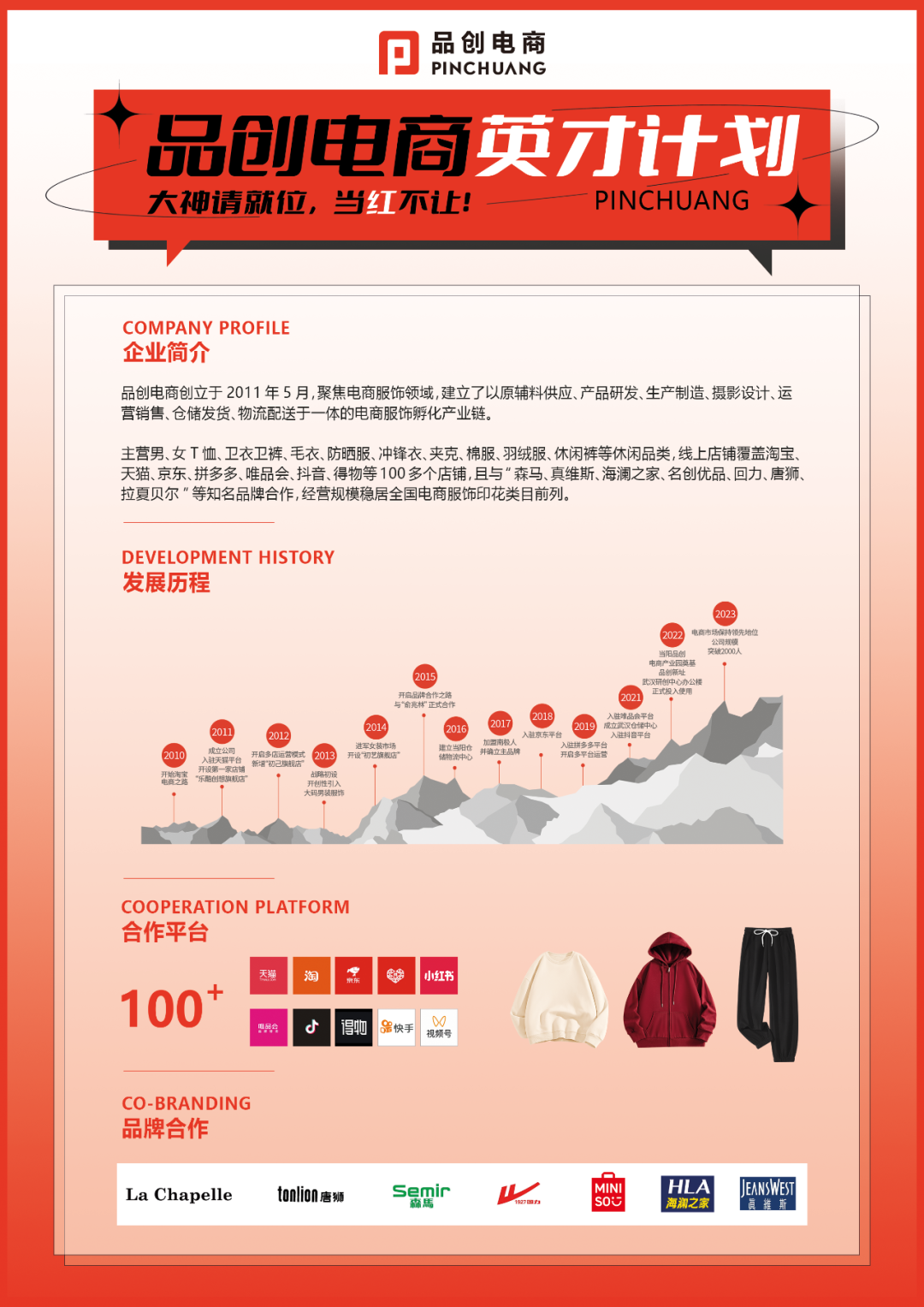 品创电商创立于2011年5月,聚焦电商服饰领域,建立了以原辅料供应、产品研发、生产制造、摄影设计、运营销售、仓储发货、物流配送于一体的电商服饰孵化产业链。