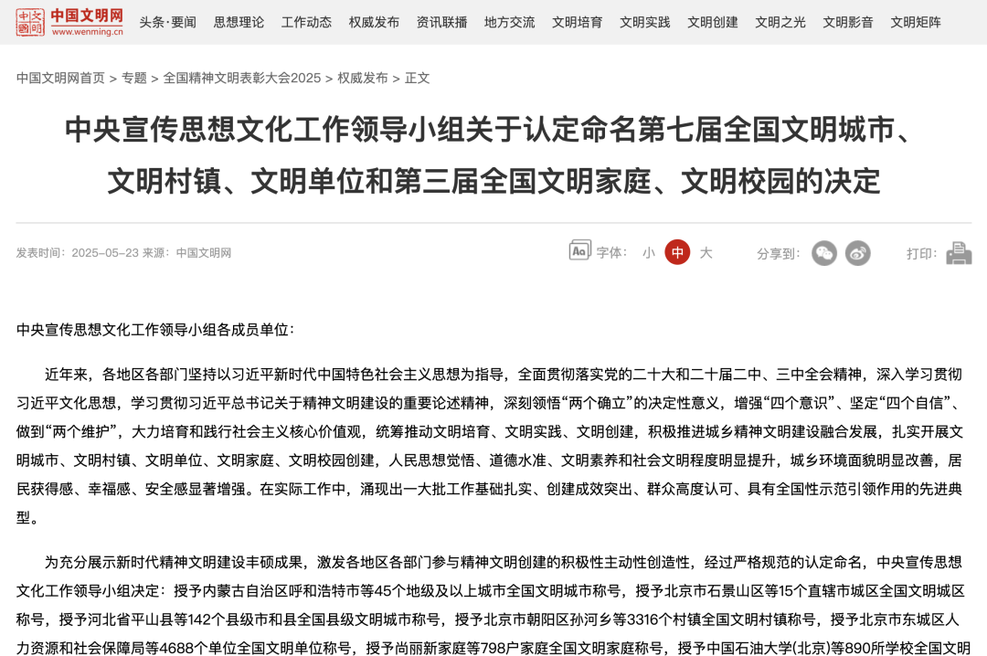5月23日,全国精神文明建设表彰大会在北京召开,会议表彰了第七届全国文明城市、文明村镇、文明单位和第三届全国文明家庭、文明校园。