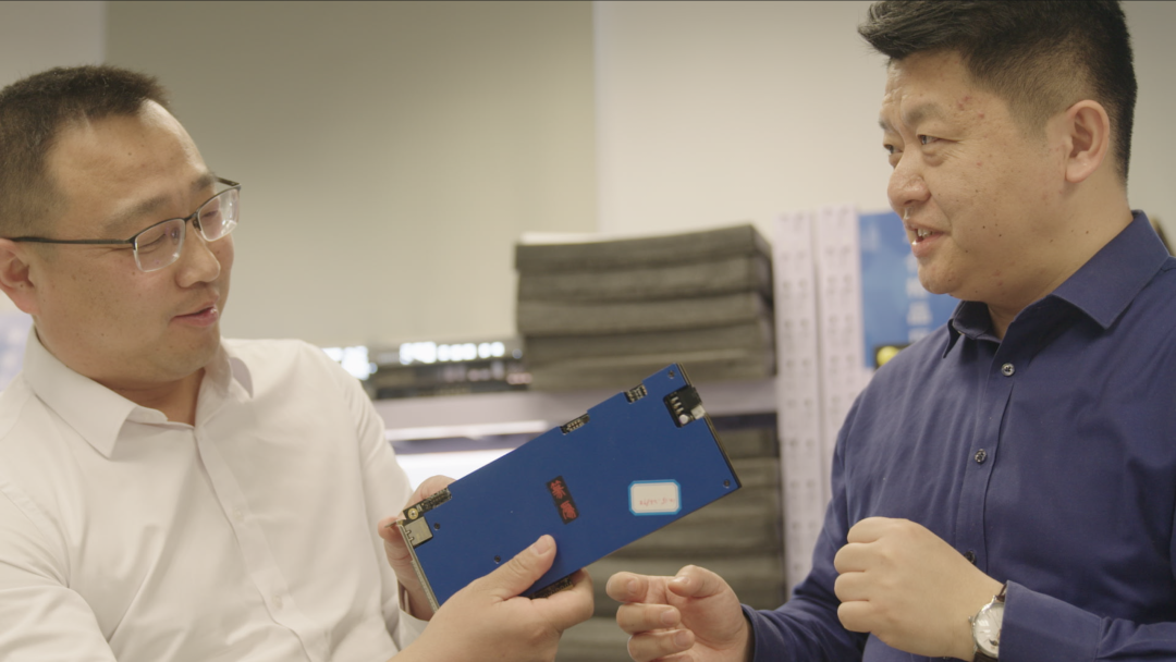 篆为科技创始人饶东(右)向合作伙伴讲解篆为DPU智能网卡产品