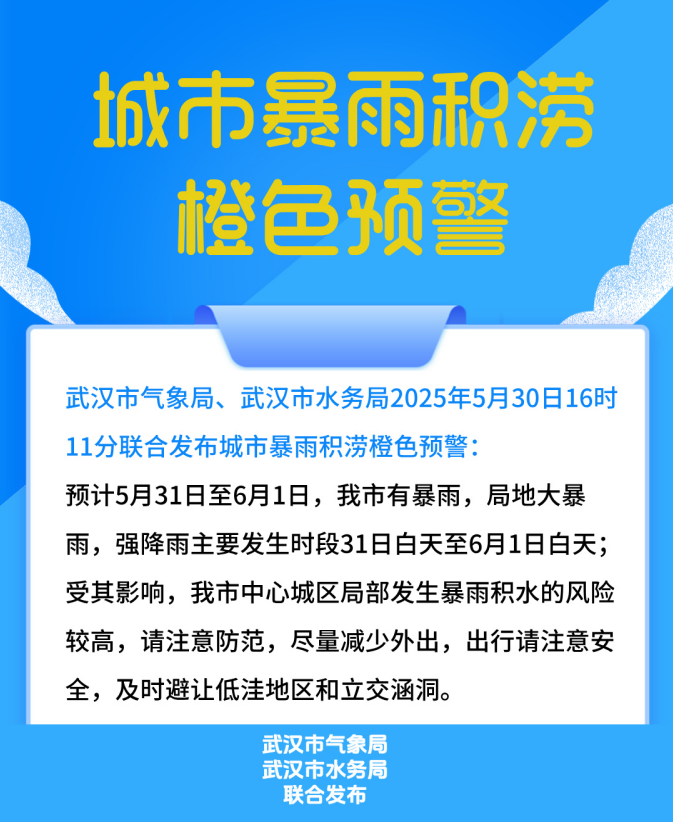 5月30日下午,武汉市气象局、武汉市水务局联合发布城市暴雨积涝橙色预警↓↓↓预计5月31日至6月1日,我市有暴雨,局地大暴雨。我市中心城区局部发生暴雨积水的风险较高,提醒市民注意防范,如若出行请注意安全。