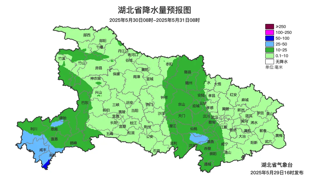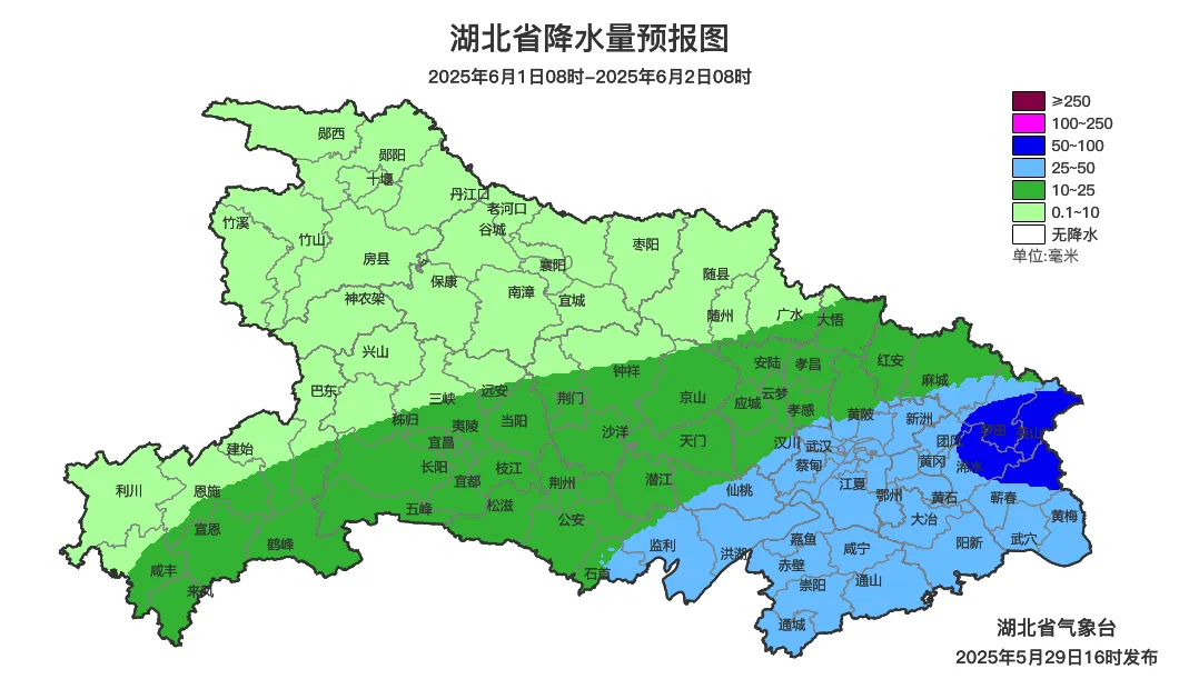 31日至6月1日为降雨最强时段,恩施、荆门、荆州、天门、仙桃、潜江、孝感、咸宁、武汉、鄂州、黄石、黄冈有大雨到暴雨,荆州、仙桃、武汉、鄂州、黄石、黄冈、咸宁等局地大暴雨,伴有短时强降水、雷暴大风等强对流天气;其他地区中到大雨,局地暴雨。最高气温20-24℃,最低气温17-21℃;偏北风3到4级、阵风5到7级。
