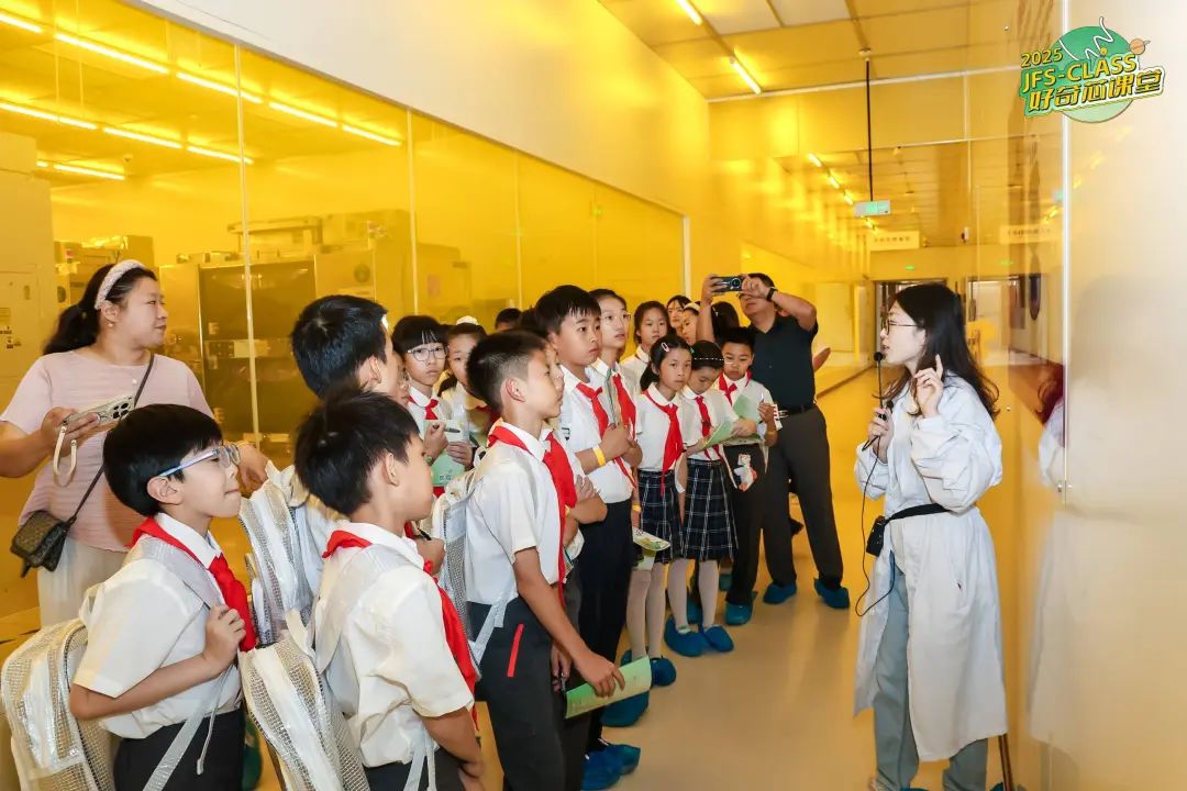 在洁净室走廊,孩子们透过观察窗,参观芯片制造工艺。面对“为什么芯片的制造场所要用玻璃罩起来?”的疑问,“原子博士”解释道:“空气中的微粒会对芯片制造过程产生严重影响,一粒小小的头皮屑落在晶圆上,就像陨石砸中城市,所以需要在非常洁净的环境中进行加工。”